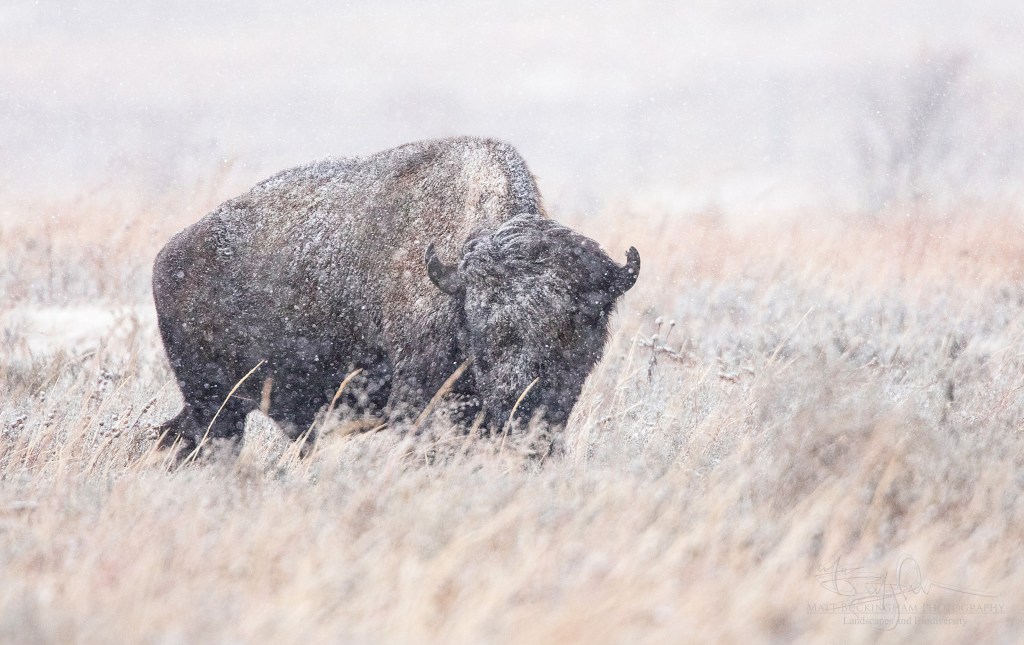 Both James and I were excited about the photo ops that these unique conditions might present. At first we thought that the wildlife must have found sheltered areas to hunker down and weather the storm. But then, just in front of our little caravan a massive bison bull bounded across the road. He was literally frolicking. He ran to join another group of bachelor bulls, and soon began to leap up and down, roll in the snow, and challenge them to play fights. It made me think back to all that time rough-housing in the snow as a kid growing up in the suburbs of Chicago. The snow must have felt downright wonderful to this massive animal with its big shaggy coat. These relics of the ice age are built to withstand the cold and snow, and the freezing precipitation must have been a welcome relief from the heat of the southern plains.