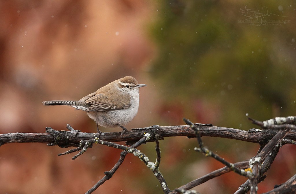I could have stayed with the sparrows all day, but it there were still some other parts of the refuge we were hoping to explore, so I made my way back to the truck. En route, a Bewick’s Wren (Thryomanes bewickii) hopped up in front of me, and sat for a few seconds surrounded by falling snow.