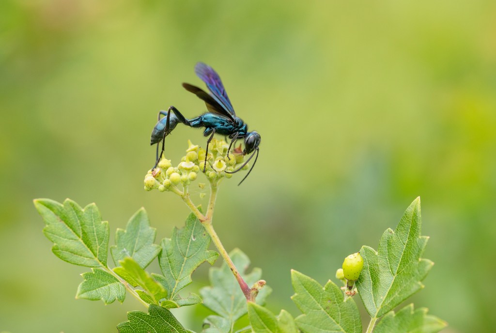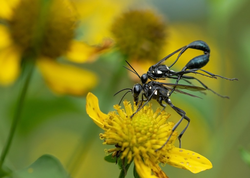This is another family in the “Apoid” wasp group and includes the “thread-waisted wasps”, which are comprised of many distinctive species. These species are among our most familiar wasps, and many are familiar sights around homes. They provision their nests with a variety of invertebrate prey from katydids to spiders.