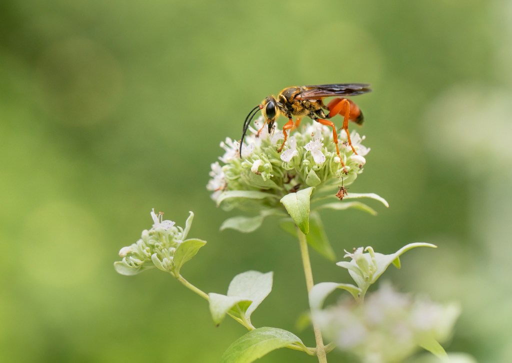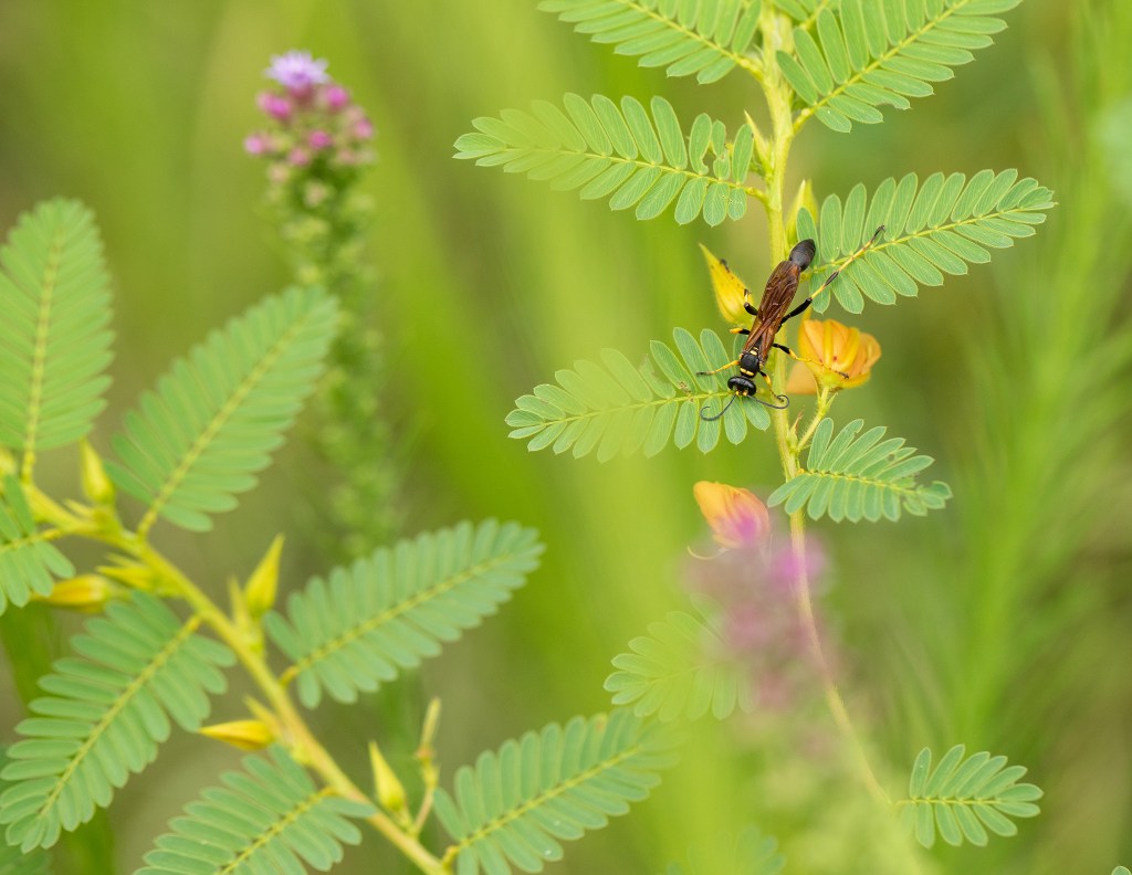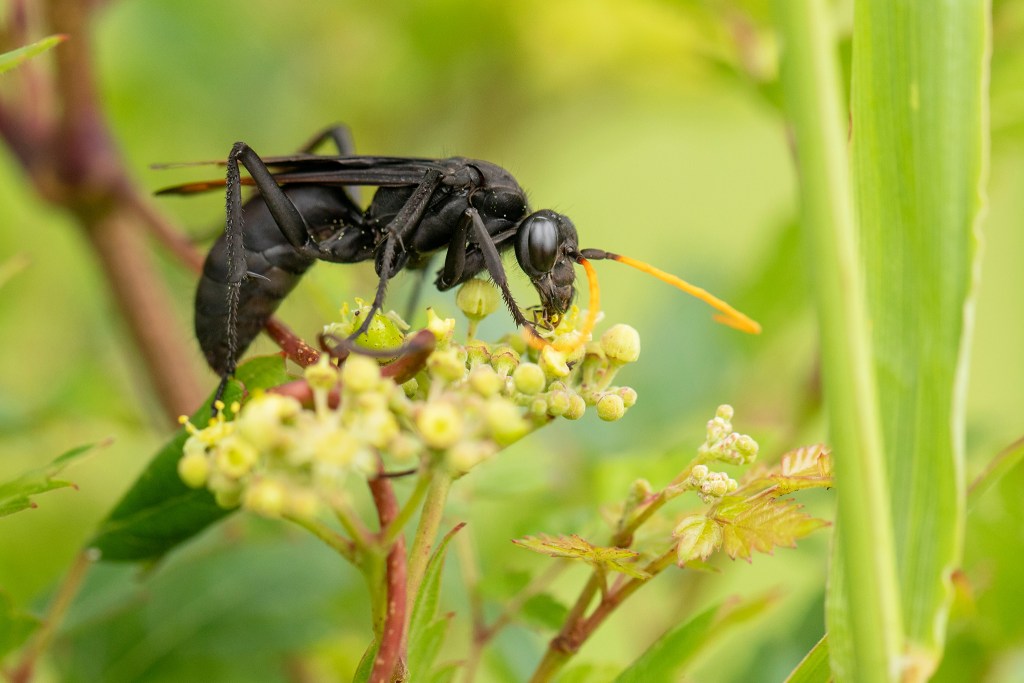 This thread-waisted wasps and others of its genus have very long, narrow abdomens (“waists”). This is one of the most widespread and frequently encountered Ammophila species in eastern North America. It does share its range with some similar congeners which typically require microscopic comparison of various morphological characteristics to differentiate. Adults feed on nectar and are frequently seen on flowers in the summer and fall. They provision their nests with paralyzed caterpillars (order Lepidoptera) and sawfly (order Hymenoptera) larvae.
