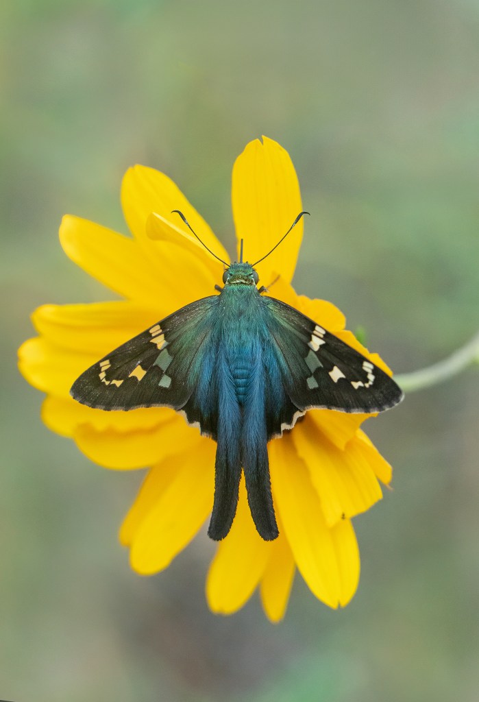 Shortly after photographing the bee above I spotted a long-tailed skipper (Urbanus proteus). These pretty butterflies are fairly common in east Texas during the summer and fall. I’ve photographed a number over the year, but always capture them with their wings folded, as this is how they typically rest. I’ve long wanted to capture an image of one resting with open wings to capture their brilliant metallic blue coloration, which is hidden when the wings close. Things finally worked out in my favor this day when this particular butterfly rested for several seconds showing off this beautiful coloration.