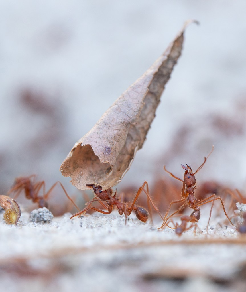 January 1, 2024 found us in an east Texas longleaf pine forest. Each year I try to make a few images of Texas leafcutter ants (Atta texana). I just think they’re so cool looking, and they have fascinating life histories! It’s so much fun to observe them as they cut leaves and haul them across the forest floor to the entrances of their colonies. Here, an ant hauls a leaf much larger than itself to fuel the underground fungus garden that will feed its colony. To me, it looks like the second ant is acting as a safeguard, ready to catch the payload should it fall backwards. In actuality I believe this ant may have been in a defensive posture, perhaps in response to my presence. Head up and mandibles open it seemed ready to defend this precious cargo.