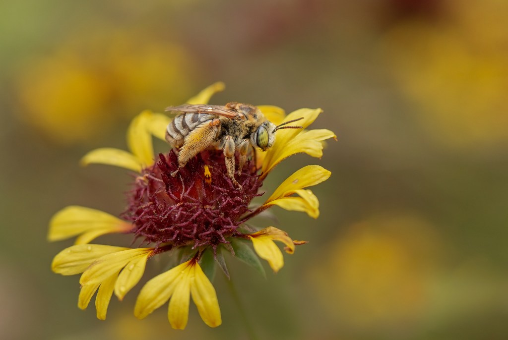 During my photographic pursuit of pollinators I was thrilled to capture an image of this female Svastra petulca, a long-horned bee, on a blanket flower (Gaillardia aestivalis). These native bees are so striking. They’re big, nearly the size of the smaller bumblebees, very fuzzy, and their bright green eyes are beautiful.
