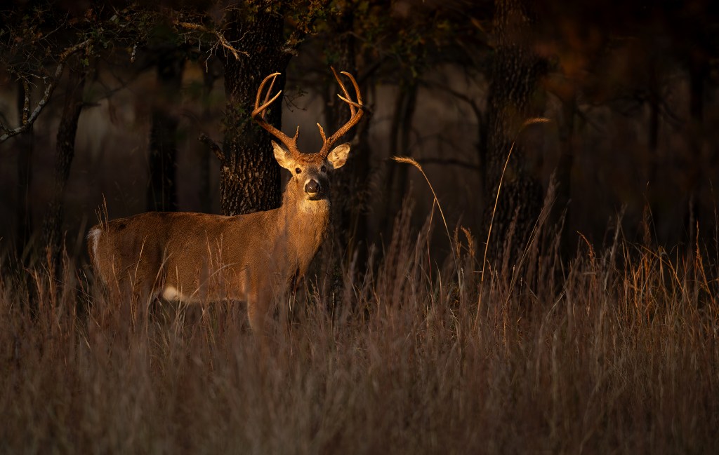 Eventually the day brightened enough that I would be able to capitalize, should he provide the opportunity. I lost him again, but moved ahead in the general direction he was moving to a clearing where a doe was feeding. Sure enough, a few minutes later he appeared at the woods’ edge. I could tell that he was interested in that particular doe, and began to allow myself to hope that I might get a shot at him. Just then, the first rays of sun began filtering through the autumn foliage of the tallest post oaks. Then the doe caught wind of the buck and set out across the clearing. “Ok,” I thought to myself. “This might be it. If he breaks for her I might just get a chance.” And then he did.
